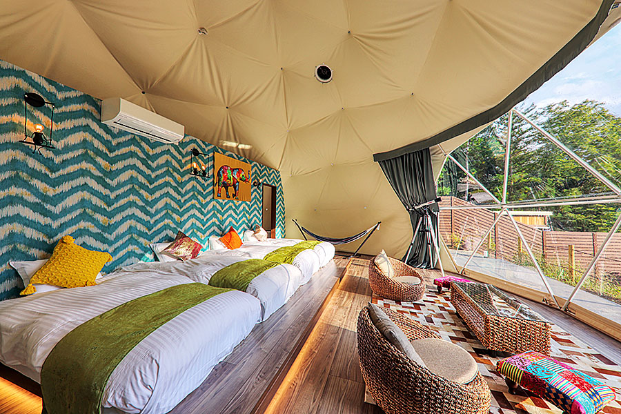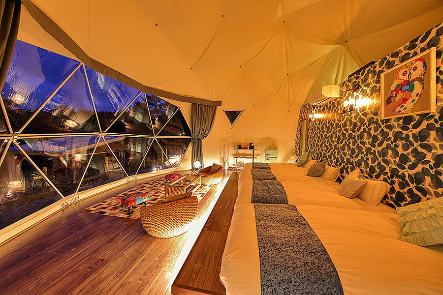 Dome-shaped tents are equipped with air-conditioners, so you can comfortably enjoy yourselves in any seasons.